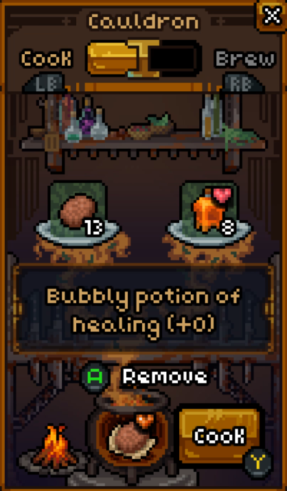 The cauldron’s second mode is cooking! But it’s not all boeuf bourguignon and souffles. In the dungeons, you cook to survive. Cooking is as simple as taking two edible ingredients and mashing them up together, creating an unholy puck of nutrition called a ration.